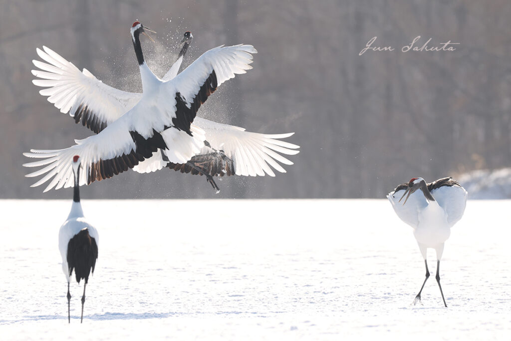 逃げるエゾシカ、乱舞するタンチョウ